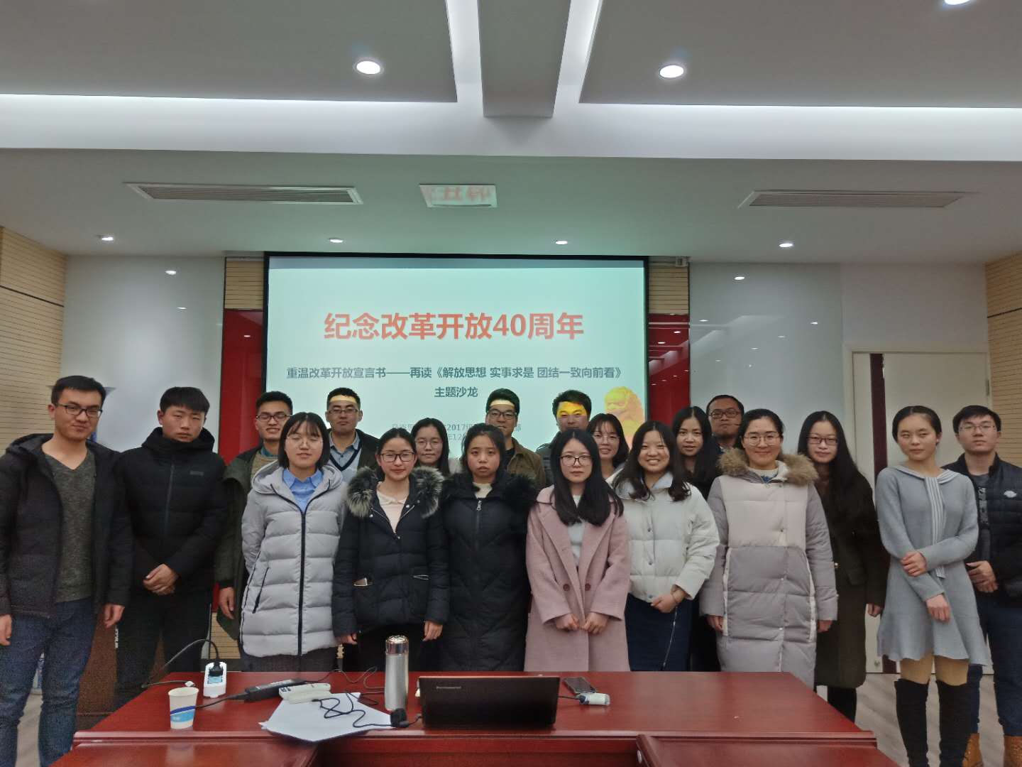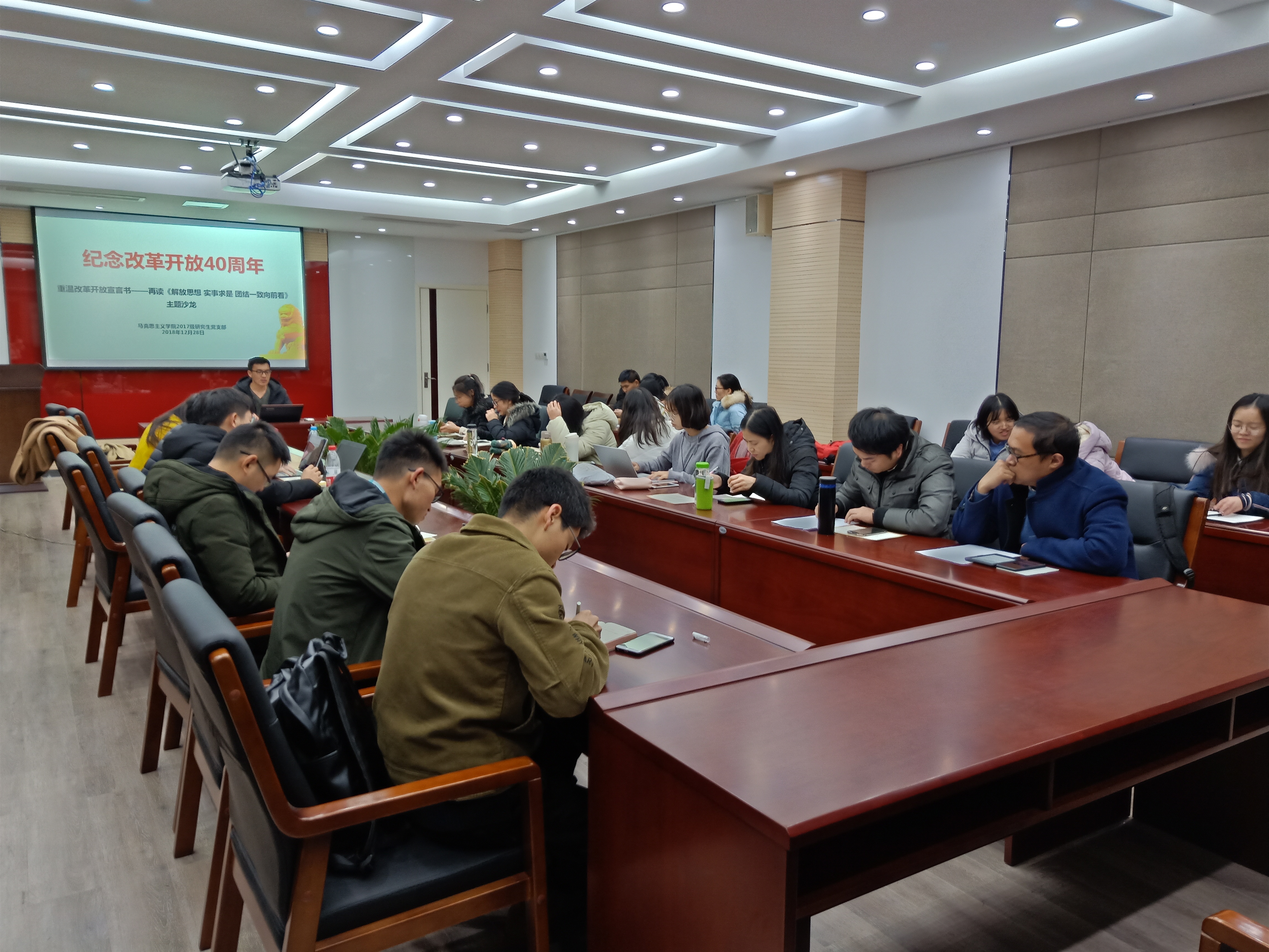 2018年12月28日,为深入学习习近平同志在庆祝改革开放四十周年大会上重要讲话精神,回顾改革开放四十年的历史成就和主要经验。我院2017级研究生党支部在法商北楼225举办“重温改革开放宣言书——再读《解放思想 实事求是 团结一致向前看》”主题沙龙活动,2017级研究生党支部党员同志和部分思政专业本科生党员同志一同参与本次活动。