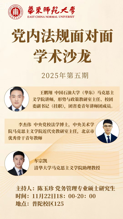 为引导党务管理专业研究生深刻把握中国特色社会主义制度优势,深化对习近平总书记关于党的建设的重要思想的理解,激励其投身中国式现代化建设的伟大实践,11月22日晚,由华东师范大学党内法规研究中心、纪检监察研究院主办的“党内法规面对面(2025)”系列学术沙龙第五期在普陀校区成功举办。