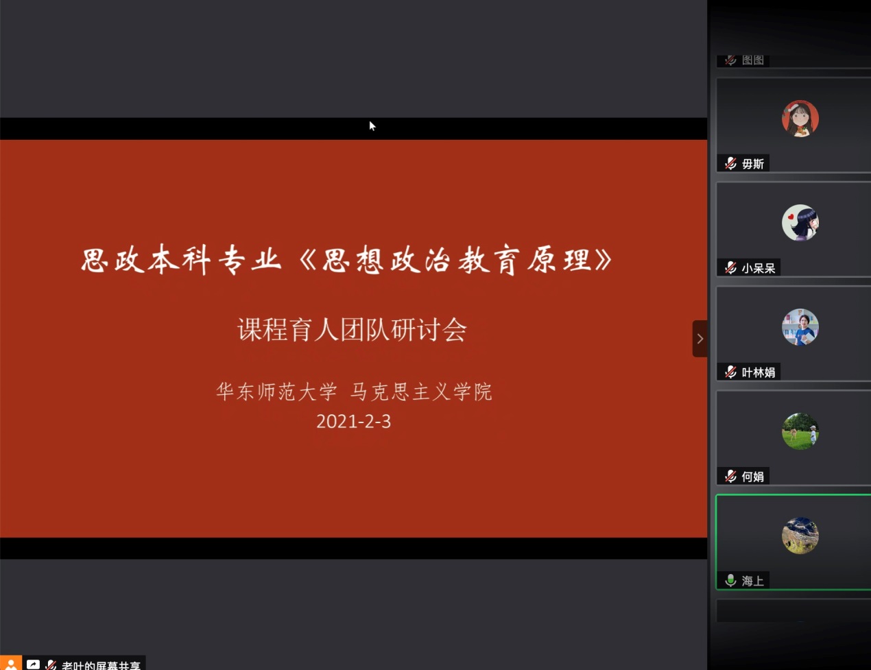 为深入贯彻落实我校卓越育人工作的相关指示,结合马克思主义学院实际情况,探索课程育人的新举措,在2月2日举行学院全体教师卓越育人工作动员大会之后,思政本科专业核心课程《思政政治教育原理》课程育人团队于2021年2月3日上午召开了卓越育人专题线上研讨会。此次会议由马克思主义学院许瑞芳副院长主持,马克思主义学院常务副院长王建新、党委副书记崔海英,以及章瑛、史俊、叶方兴、翟贤亮、尚伟伟、何娟、王霞、毋斯等老师参与了此次研讨会,孟宪承书院辅导员叶林娟应邀参加。