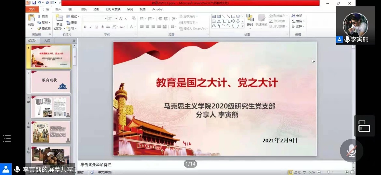围绕教育“十四五”规划和习近平总书记关于教育的重要论述,马克思主义学院2020级研究生党支部全体成员在支部书记李寅熊主持下,于2月9日晚腾讯会议线上展开学习与交流。