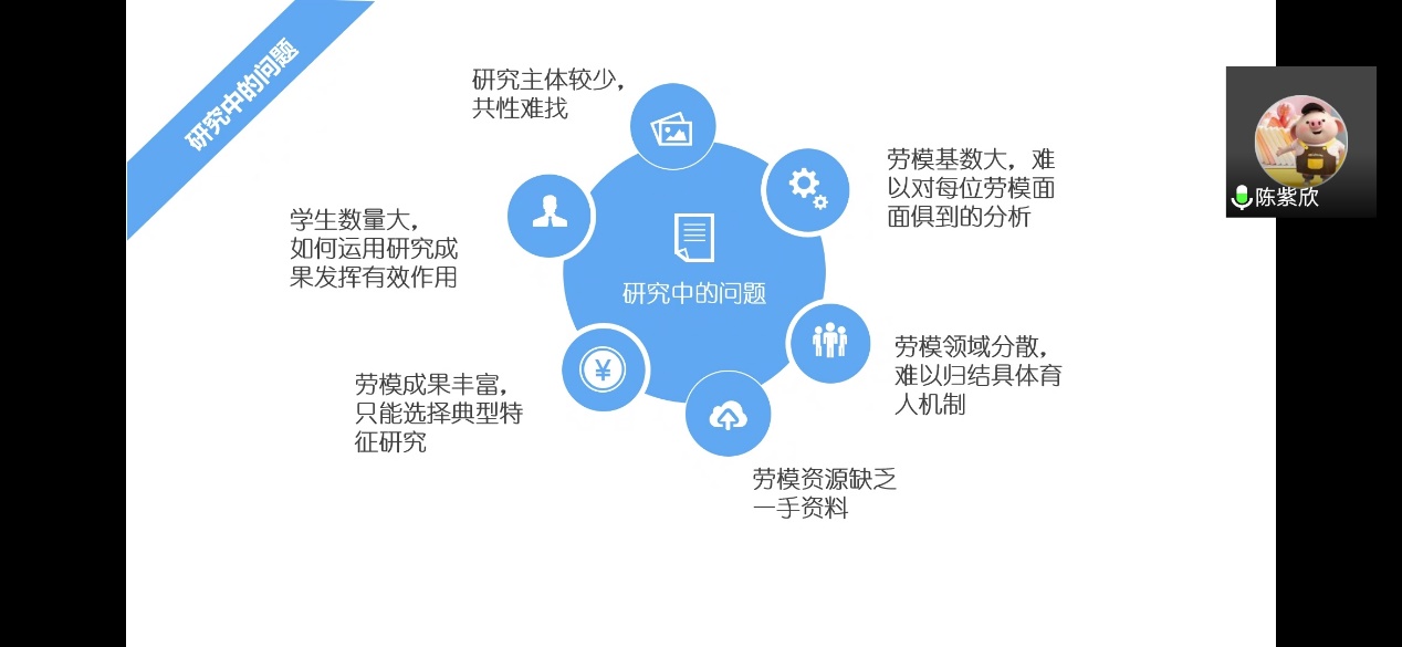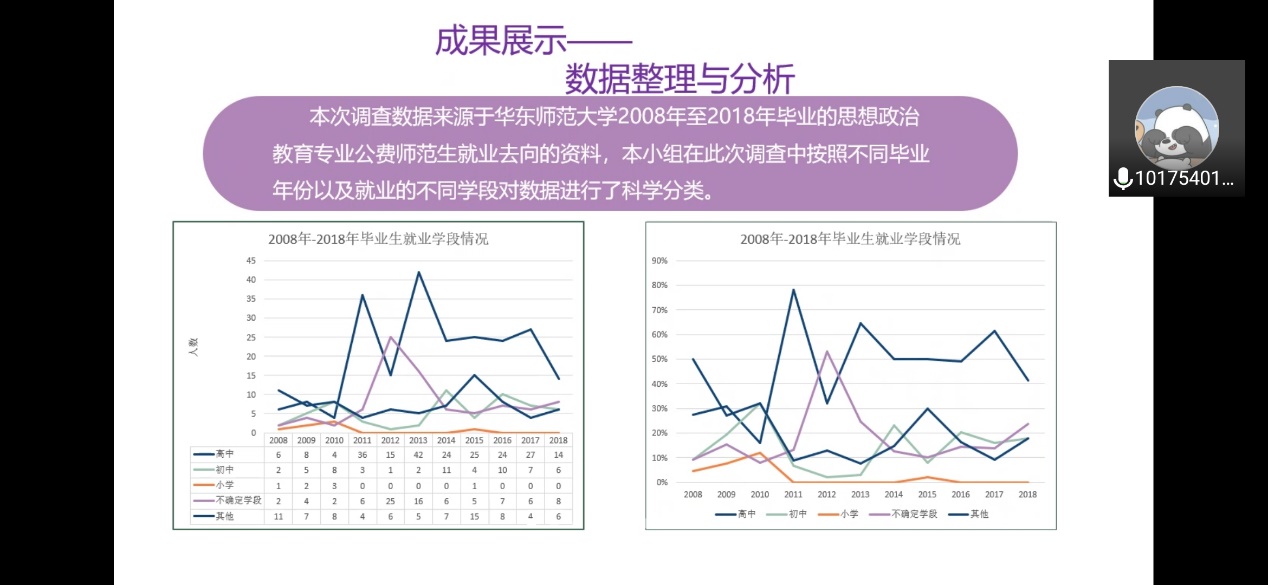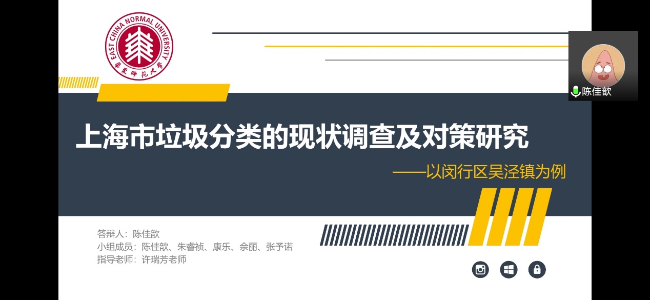 在答辩过程中,来自九个科创小组的负责人同学针对课题的前期推进情况进行精彩的汇报答辩,项目分别是曹可同学主持的《高校培育和践行社会主义核心价值观路径研究——以劳模精神育人为例》,吴语桐同学主持的《主题教育背景下基层党组织提升“农村改厕”成效的路径研究—以江苏省民政村为例》,王子涵同学主持的《公费师范生就业学段下滑现象研究——以思想政治教育专业为例》,张舰同学主持的《私生饭文化及其疏导途径的研究》,陈佳歆同学主持的《上海市垃圾分类的现状调查及对策研究——以闵行区吴泾镇为例》,罗芳同学主持的《旅游型村落中青少年自我教育期望成因探究》,韩笑同学主持的《“三全育人”视角下高校思想政治理论课程实效性提升探究——以华东师范大学为例》,汪佳妮同学主持的《新高考背景下思想政治教育教师教学发展及对思想政治教育专业师范生的启发》以及陈紫欣同学主持的《上海市高校劳模精神育人机制——以华东师范大学为例》。