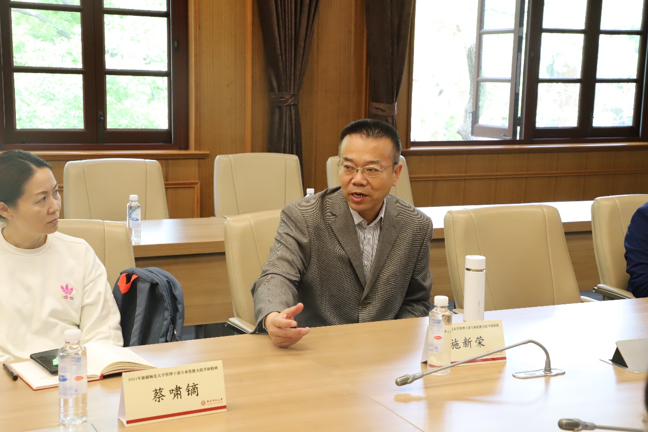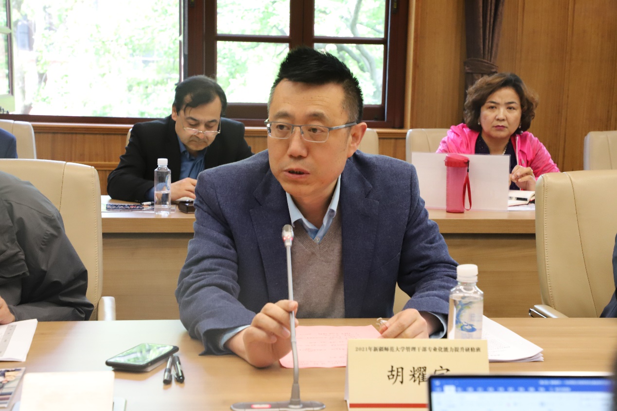 新疆师范大学管理干部专业化能力提升研修班是为了进一步贯彻国家对口帮扶支援政策,继续深化校际交流合作,落实《华东师范大学 新疆师范大学对口支援补充协议》相关精神的重要举措,结合党史学习教育,由教育部高校思想政治工作队伍培训研修中心(华东师范大学)于2021年4月19日至25日举办,新疆师范大学共37名处级干部参加研修,研修班通过“专题报告、现场教学、案例教学、经验分享、主题研讨”等教学环节实施课程计划,邀请了我校城市与区域科学学院副院长孔翔教授、数据科学与工程学院院长钱卫宁教授、经济与管理学部副主任殷德生教授、人文与社会科学研究院副院长吴文钰、科技处成果与知识产权管理办公室主任匡磊、教务处副处长丁旵明、研究生院副院长杨福义、研究生院学位管理办公室主任李海生等作专题报告,以提升管理干部政治素养和履职能力,为新疆师范大学实现“一流师范”办学目标提供政治保障和队伍支撑。