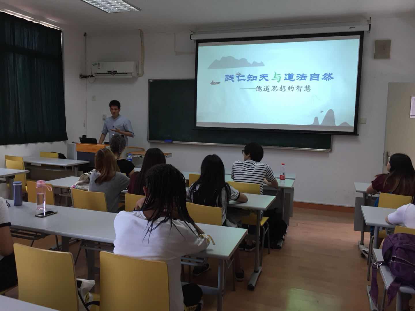 6月13日下午一点,马克思主义学院、国际汉语学院共同举办的“向国际生讲中国故事”第三讲在中北校区国际汉语教学楼213开讲。哲学系副教授苟东锋受邀为国际学生讲授了“践仁知天与道法自然——儒道思想的智慧”。