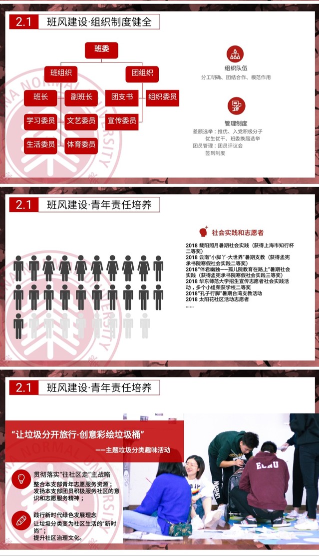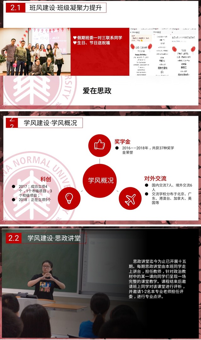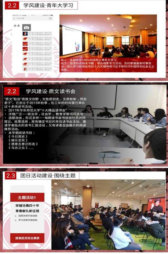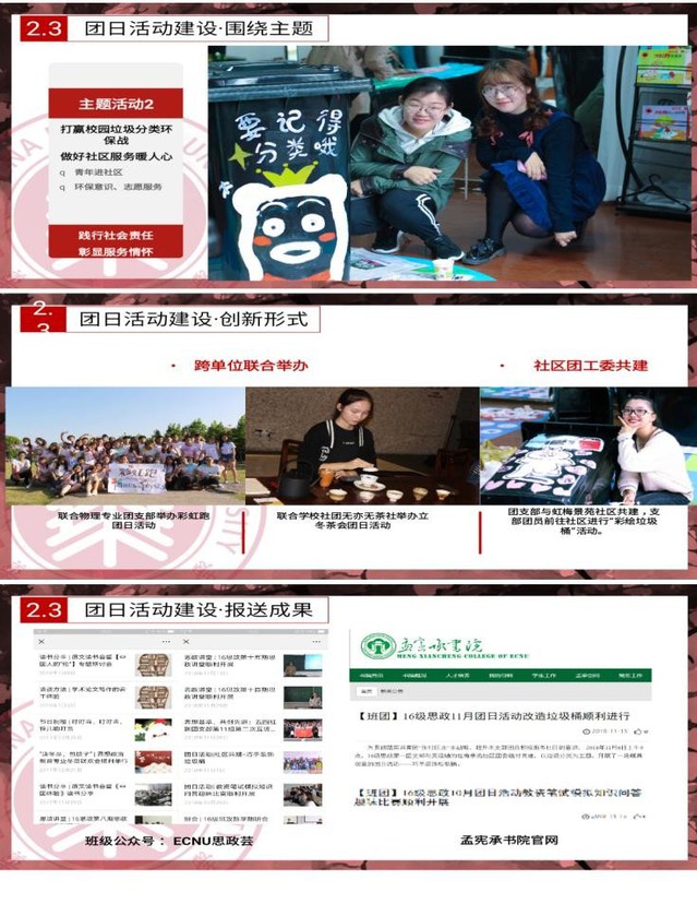 2018年12月24日,“2018年上海市五四红旗团支部”创建(第十一组)互评会议在上海第二工业大学高职院校学术交流中心207会议室举行。华东师范大学马克思主义学院思想政治教育专业2016级第一团支部形式独特的团日活动,开设思政课堂,将“乐学思政”贯穿支部工作。