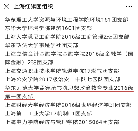 近日团市委公布了2018年度“上海市五四红旗团组织”评选结果,华东师范大学马克思主义学院(孟宪承书院)思想政治教育2016级第一团支部获评“上海市五四红旗团支部”,这也是华东师范大学本科组织中唯一以班集体为单位获得此荣誉。