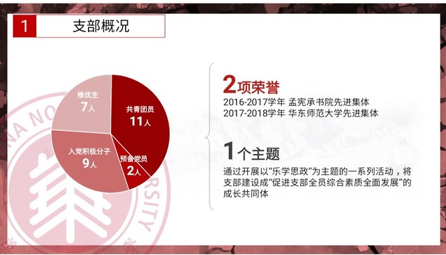 由于我校对本科生的培养实施学院和书院的双重管理,我院2016级思想政治教育专业第一团支部隶属孟宪承书院,建立于2016年9月,由29名团员组成。团支部自建立以来,通过整合学院以及书院的支部资源,发挥支部专业优势,以“乐学思政”为核心主题,积极开展支部活动,在书院和学院团委的关心和指导下逐渐走向成熟。