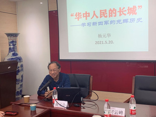 杨老师的报告主题是“'华中人民的长城——学习新四军的光辉历史”。首先,杨老师从习近平总书记给上海市新四军研究会百岁老战士的回信切入,强调我们要继续深化新四军史料研究,开展革命传统教育。接着,杨老师对新四军的成立作简短而又精炼的介绍,强调新四军的建立是来之不易的,新四军的诞生经历一个复杂和长期的谈判。随后,杨老师给出一组数据,他结合新四军在1939-1940近一年时间里增加了近四万人的数据,详细介绍新四军发展壮大的历史过程和“向南巩固、向东作战、向北发展”战略方针。按照时间线索,杨老师介绍了皖南事变的始末以及事变后军部重建的具体情况,对7个师的人员安排、活动事项、活动范围做了详细介绍。最后,他阐述了新四军的浴火奋战为推动抗日战争胜利的重大意义。