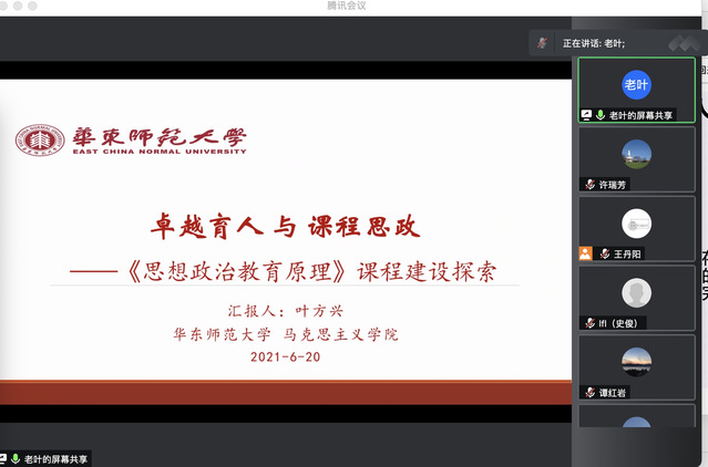 随后,黄亚玲、翟贤亮、章瑛三位教师分别交流课程思政教学设计的经验与心得。黄亚玲副教授重点分享《中国共产党史》课程思政设计中如何有效发挥显性思政教育功能,并提出课程思政的教学设计应着力于探索可以推广的、具有普遍性的经验做法。翟贤亮老师以《人格教育学》的课程思政建设为例,认为课程思政教学设计应该着眼于学生成长发展的内在需求,从学生的需要出发开展课程教学。章瑛副教授以自己教授近30年的《法学概论》课为例,从自身的切身体会入手,讨论了课程思政建设中的教师职业观念、教学指南编订等议题。叶方兴副教授系统汇报了《思想政治教育原理》课程建设的基本情况,详尽梳理了《思想政治教育原理》课程建设的历程、具体方案、存在问题以及未来展望。