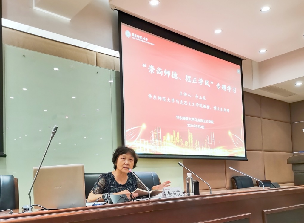 身正为先,领好新生德性教育第一步。在新生责任教育“崇尚师德,摆正学风”的专题学习中,马克思主义学院思想政治教育系党支部的优秀党员余玉花同志以自身的体会为新生上了生动的“开学第一课”。她表示像马克思主义理论、思想道德法律与修养等课程实际上都是在讲做人的道理,尤其是马院学生在以后走上的工作岗位中更要将“做人”的态度摆正。余玉花同志用马克思主义的立场方法引导学生读书、看问题、建立信仰,明确反对将马克思主义口号化、教条化,指出党和国家对教师这个职业给予很高评价,同时也寄予教师厚望,国家教育的兴衰在教师,希望大家对此职业具有信心和敬重感,并强调教师职业的特殊性和师德的重要性,因此要做到“德配其位”。余玉花同志入党,49年、从事教育事业39年治学严谨、关爱学生,注重总结反思从而不断提升教师职业修养,其从教经历充分也充分诠释了一个教师党员的高尚师德与教育情怀。