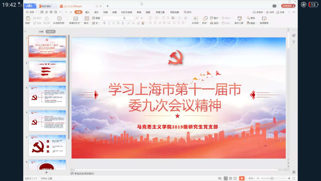 为深入学习贯彻上海市第十一届市委九次会议精神和习近平总书记考察上海重要讲话精神,坚持以人民为中心的发展思想,7月17日晚7点,马克思主义学院2019级研究生党支部以线上钉钉会议的方式开展“学习上海市第十一届市委九次会议精神”党日活动。此次会议由党支部书记郑文博同志主持,2019级全体党员同志参加。