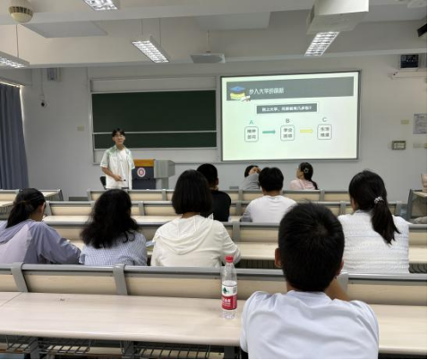 2024级本科生侯君豪同学从“个人经历”、“学习篇”和“生活篇”三个方面分享了自己大学生活的经验。他着重谈到寒假返乡回高中宣传如何做,特别提醒新生要按学校时间节奏走。他同时告诉新生“提前研读专业培养方案,明确毕业要求”,避免“盲目参与无意义活动”。这份干货满满、详尽细致的分享,为新生们提供了实用的学习技巧、丰富的资源信息以及平衡学习与生活的有益参考。2024级研究生苏慧洁同学则从“研究生”和“过来人”的双重视角,为新生们带来了一份前瞻性的“大学攻略”。她围绕“如何让本科四年为未来增值”这一主题,阐述了绩点作为学业基石的重要性,分享了关于写作、演讲、英语等核心能力的培养心得,并引导新生学会充分利用校园资源、真诚地向师长前辈请教,鼓励大家做好规划、勇敢体验,度过一段无悔的青春岁月。